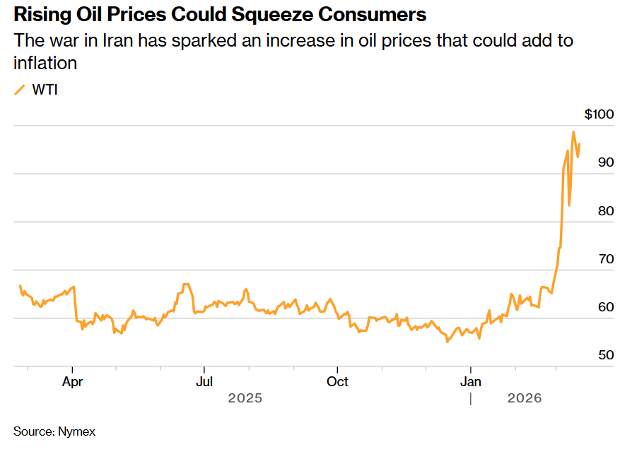 如上图所示,油价上升可能严重挤压破钞者——伊朗干戈激励了油价上升,这可能将会大举推高通胀。